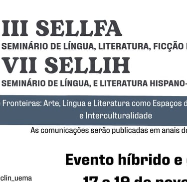 O evento, que já é tradição no Curso de Letras da UEMA, é composto por dois seminários simultâneos e abre espaço para debates sobre Língua, Literatura e Arte em suas mais diversas manifestações. O SELLIH é voltado para produções em Língua ou Literatura Hispânica, enquanto o SELLFA abre ainda mais as portas para outras Línguas, Literaturas, Ficções e Artes.